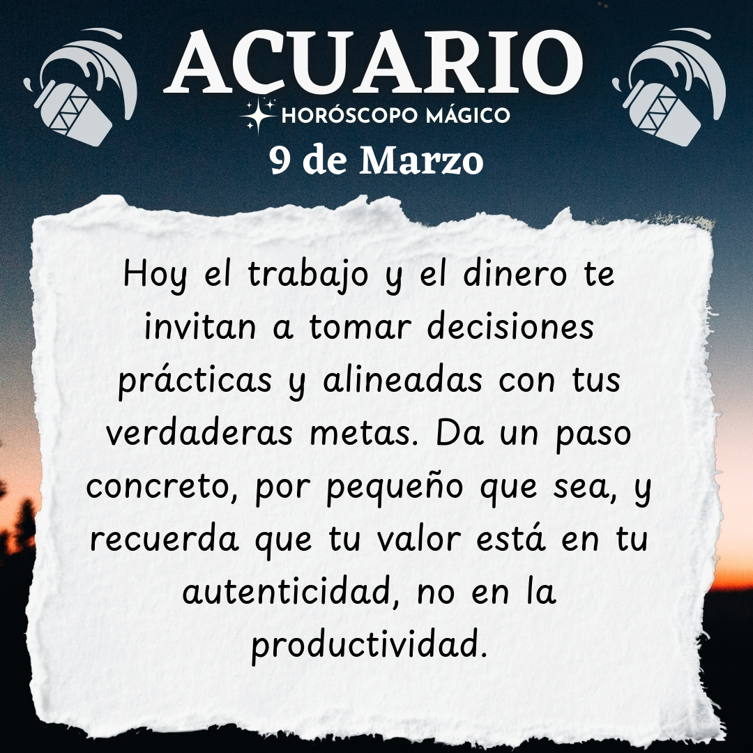 Hoy el trabajo y el dinero te piden decisiones prácticas, Acuario. Puede que sientas cierta presión por resultados o que las expectativas externas te pesen más de lo habitual. Es posible que percibas miradas o comentarios que te hacen dudar de tu propio ritmo, y que la comparación con otros despierte en ti una inquietud difícil de nombrar. No te dejes arrastrar por la prisa ni por la comparación. Recuerda que cada proceso es único y que tu camino no tiene por qué parecerse al de nadie más. Este es un buen día para revisar tus prioridades y preguntarte si tus esfuerzos están alineados con lo que realmente quieres construir, con esa visión íntima que a veces guardas solo para ti.