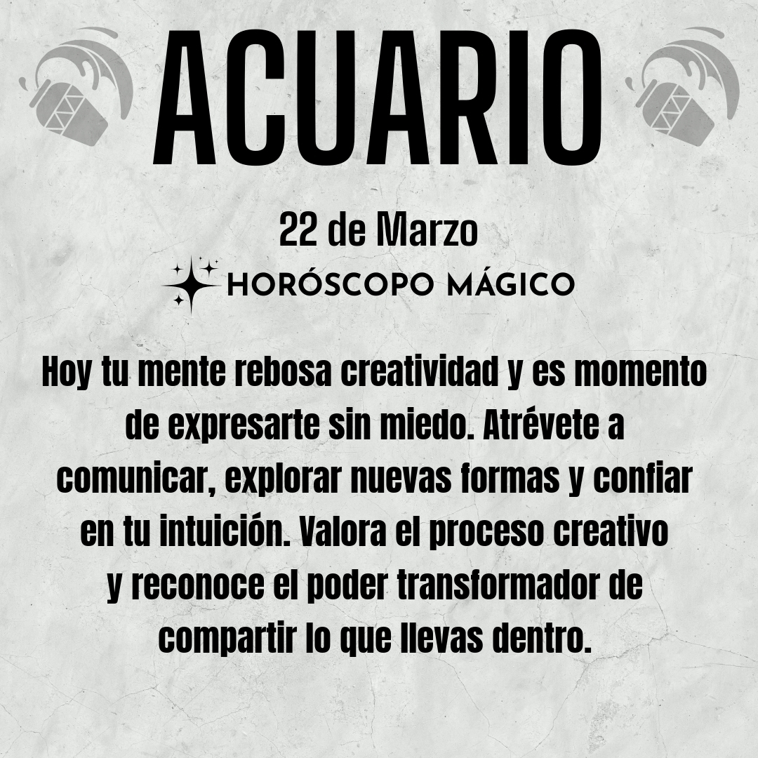 Tu mente hoy está llena de ideas, Acuario. Sientes la necesidad de expresarte, de compartir lo que piensas, de crear algo nuevo. No te guardes esa chispa creativa por miedo a no ser entendido. La comunicación es tu puente con el mundo, y hoy puedes usarla para inspirar, conectar o simplemente liberar lo que llevas dentro. Hay una energía vibrante en tu interior que te impulsa a buscar nuevas formas de mostrar quién eres, y aunque a veces dudes de si los demás comprenderán tu visión, recuerda que tu autenticidad es tu mayor fortaleza.