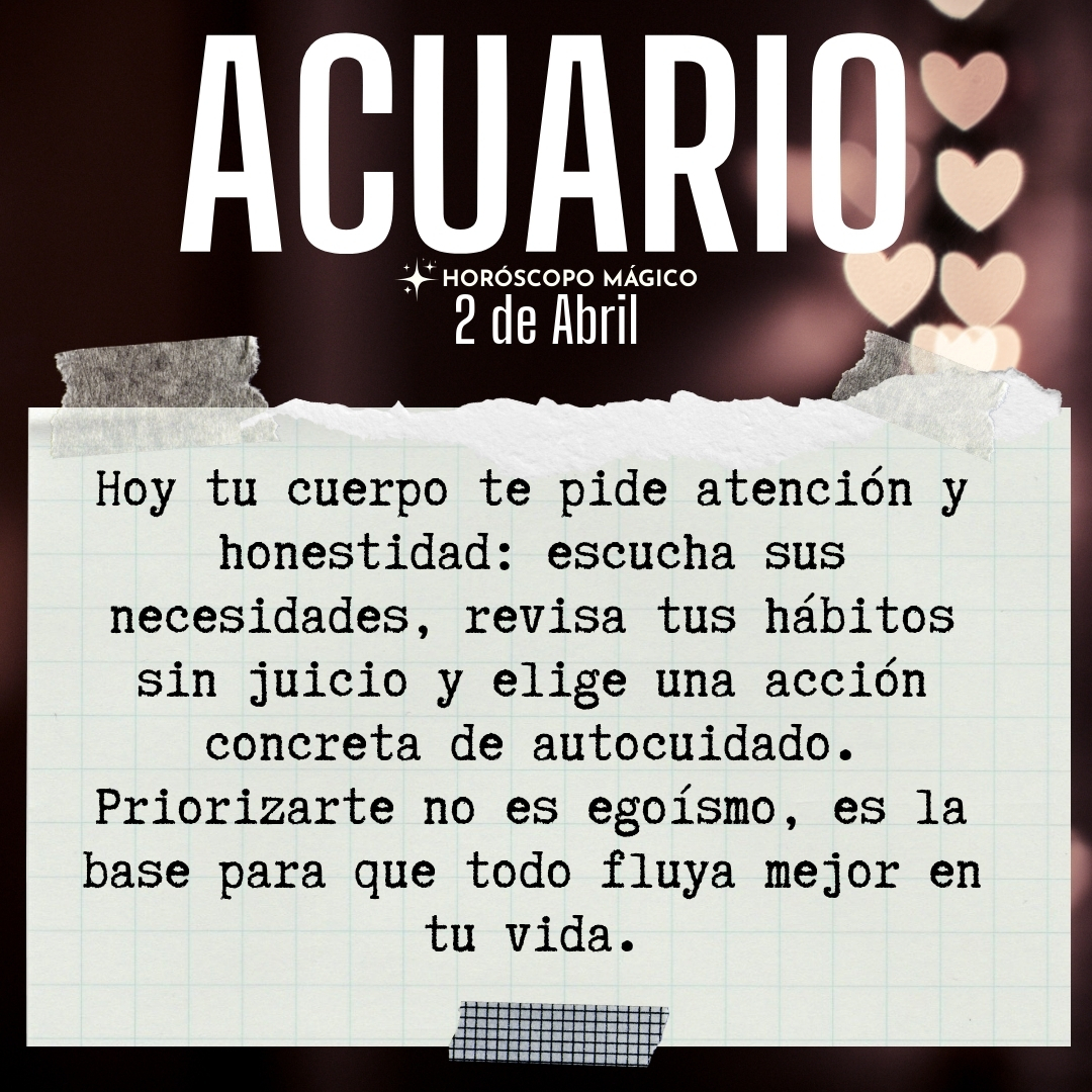 Hoy tu cuerpo te pide atención, Acuario. No es solo cansancio físico, es esa sensación sutil de que podrías cuidarte mejor, de que mereces un espacio propio en tu agenda. Has estado priorizando mil cosas, pero tu energía necesita un respiro. Escucha lo que tu cuerpo te susurra: tal vez es hora de ajustar rutinas, de regalarte una comida consciente, de moverte de una forma que te haga sentir vivo. No se trata de exigirte más, sino de abrazar el autocuidado como un acto de amor propio. A veces, el cuerpo habla en silencios, en pequeñas molestias o en esa fatiga que no desaparece con una noche de sueño. Permítete reconocer esas señales, sin ignorarlas ni minimizarlas.