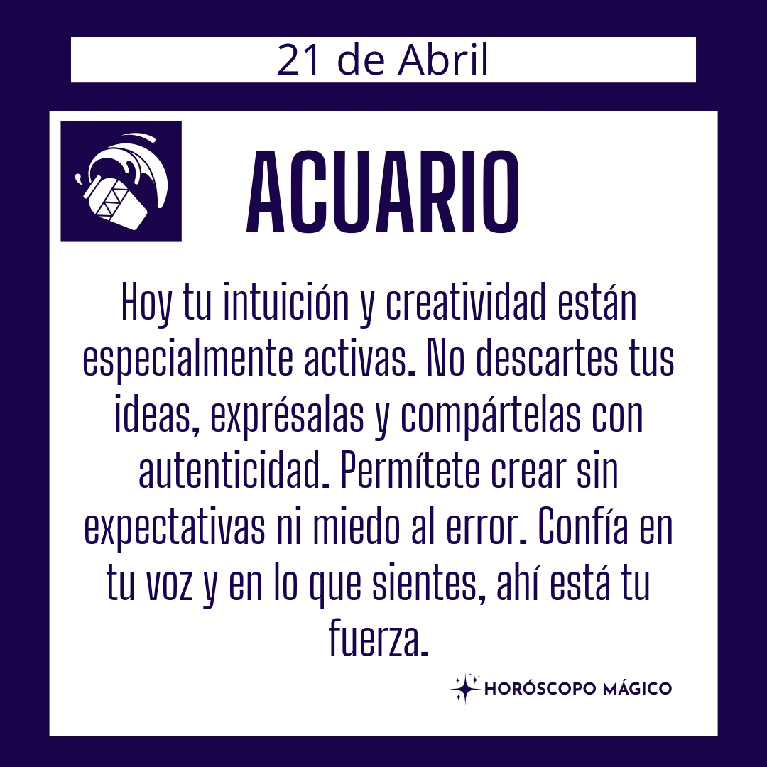 Tu intuición hoy está más despierta de lo habitual, Acuario. Hay ideas que te rondan la cabeza, destellos de creatividad que aparecen cuando menos lo esperas, como si el universo te susurrara secretos al oído en los momentos más cotidianos. No los ignores ni los descartes por parecer poco prácticos, aunque a veces te asuste su intensidad o te cueste encontrarles un sentido inmediato. Permítete sentir esa chispa, ese cosquilleo interno que te invita a mirar el mundo desde otra perspectiva. A veces, lo que parece una locura es el inicio de algo grande, y solo necesitas un poco de valor para dar el primer paso hacia lo desconocido.
