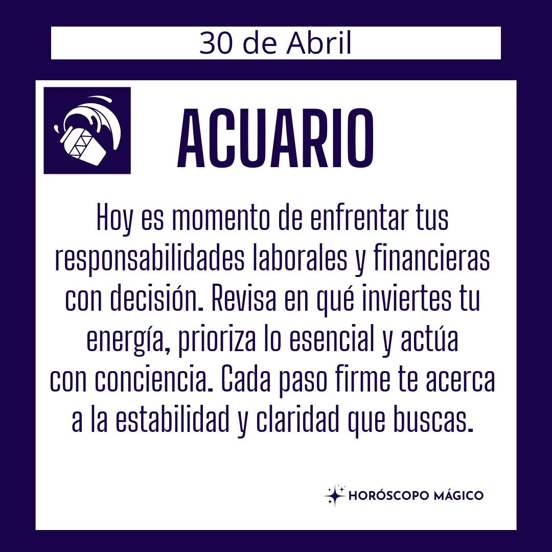 Hoy el trabajo y el dinero te piden decisiones prácticas, Acuario. Has estado postergando asuntos importantes, tal vez por miedo a equivocarte o por no querer enfrentarte a ciertas realidades. Pero hoy es el momento de mirar de frente tus responsabilidades y tomar acción. No se trata de hacerlo todo perfecto, sino de avanzar con paso firme y consciente. A veces, la vida te pone en una encrucijada donde no puedes seguir esperando que las cosas se resuelvan solas; es necesario que seas tú quien dé el primer paso, aunque sientas incertidumbre o temor al resultado.
