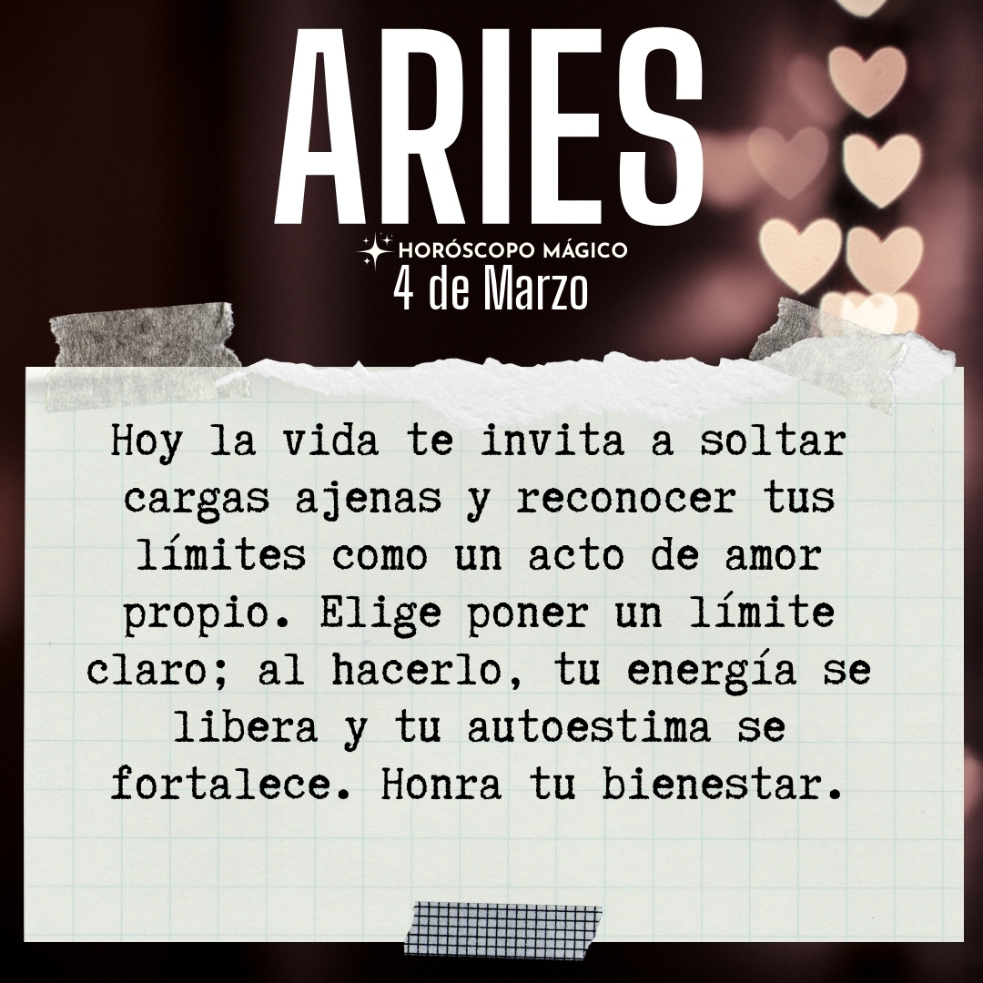 Hoy la vida te invita a revisar tus límites. Has estado cargando con responsabilidades que no te corresponden, quizás por miedo a decepcionar o por costumbre. Es momento de preguntarte hasta dónde quieres llegar y qué cargas puedes soltar. No tienes que demostrar nada a nadie, Aries. .