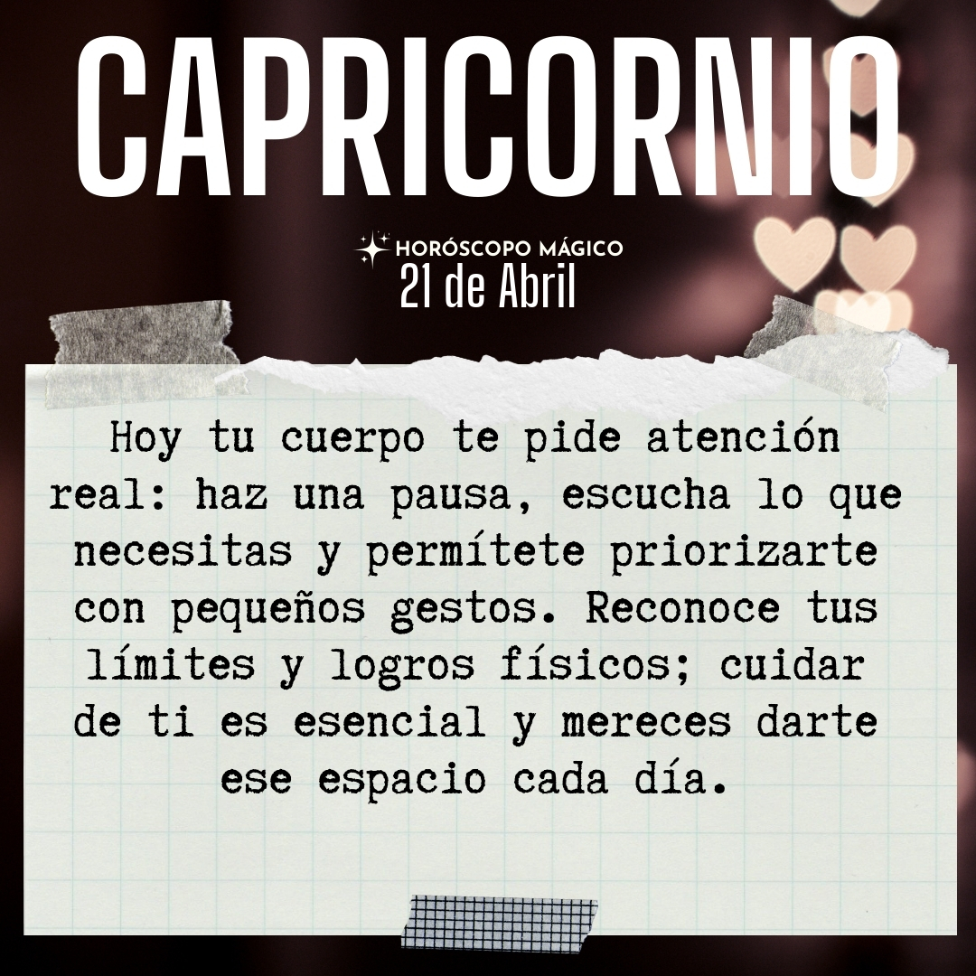 Hoy tu cuerpo te pide atención, Capricornio. No se trata solo de cumplir con rutinas, sino de escucharte de verdad. ¿Hace cuánto no te detienes a sentir cómo respiras, cómo caminas, cómo te alimentas? Tal vez llevas días, semanas, incluso meses, funcionando en piloto automático, dejando que las obligaciones y las expectativas externas marquen el ritmo de tus días. El ritmo de la vida puede empujarte a ignorar señales sutiles, pero hoy es un buen día para reconectar con tu bienestar físico. Haz una pausa, aunque sea breve, y pregúntate qué necesitas de verdad: descanso, movimiento, agua, o simplemente un momento de silencio. Permítete sentir, sin juzgar, lo que tu cuerpo intenta decirte en cada pequeño malestar o en cada suspiro profundo.