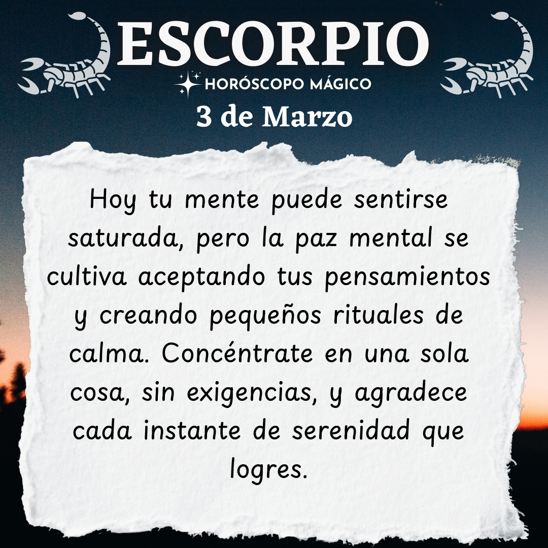 La paz mental no es un destino, Escorpio, es una práctica diaria. Hoy, tu mente puede sentirse saturada, dispersa, atrapada en mil pensamientos. No luches contra ellos, obsérvalos. La calma llega cuando dejas de pelearte con lo que sientes y empiezas a aceptarlo..
