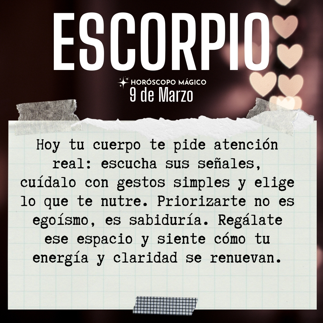 Hoy tu cuerpo te pide atención, Escorpio. No se trata solo de descansar, sino de escuchar lo que realmente necesita. Has estado exigiéndote mucho, y aunque tu mente es fuerte, tu energía física también merece respeto. Haz una pausa consciente, siente tu respiración, nota si hay tensión en tus hombros, en tu espalda, en tu estómago. El autocuidado no es un lujo, es una base para todo lo demás. A veces, el ritmo de la vida te arrastra y olvidas que tu cuerpo es el vehículo que sostiene tus sueños, tus emociones y tus batallas diarias.