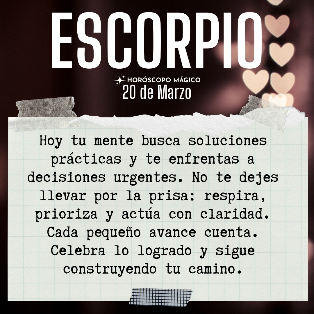 Hoy tu mente está enfocada en lo práctico, Escorpio. Hay decisiones que no pueden esperar más, y lo sabes. El trabajo, el dinero, los proyectos: todo parece pedirte respuestas claras y acciones concretas. Puede que sientas presión, pero también tienes la capacidad de ver más allá del caos y encontrar soluciones. Es como si el universo te estuviera poniendo a prueba, invitándote a demostrar esa fortaleza interna que tantas veces te ha sacado adelante. Sientes el peso de las expectativas, propias y ajenas, pero también reconoces en tu interior una voz que te recuerda que eres capaz de mucho más de lo que imaginas.