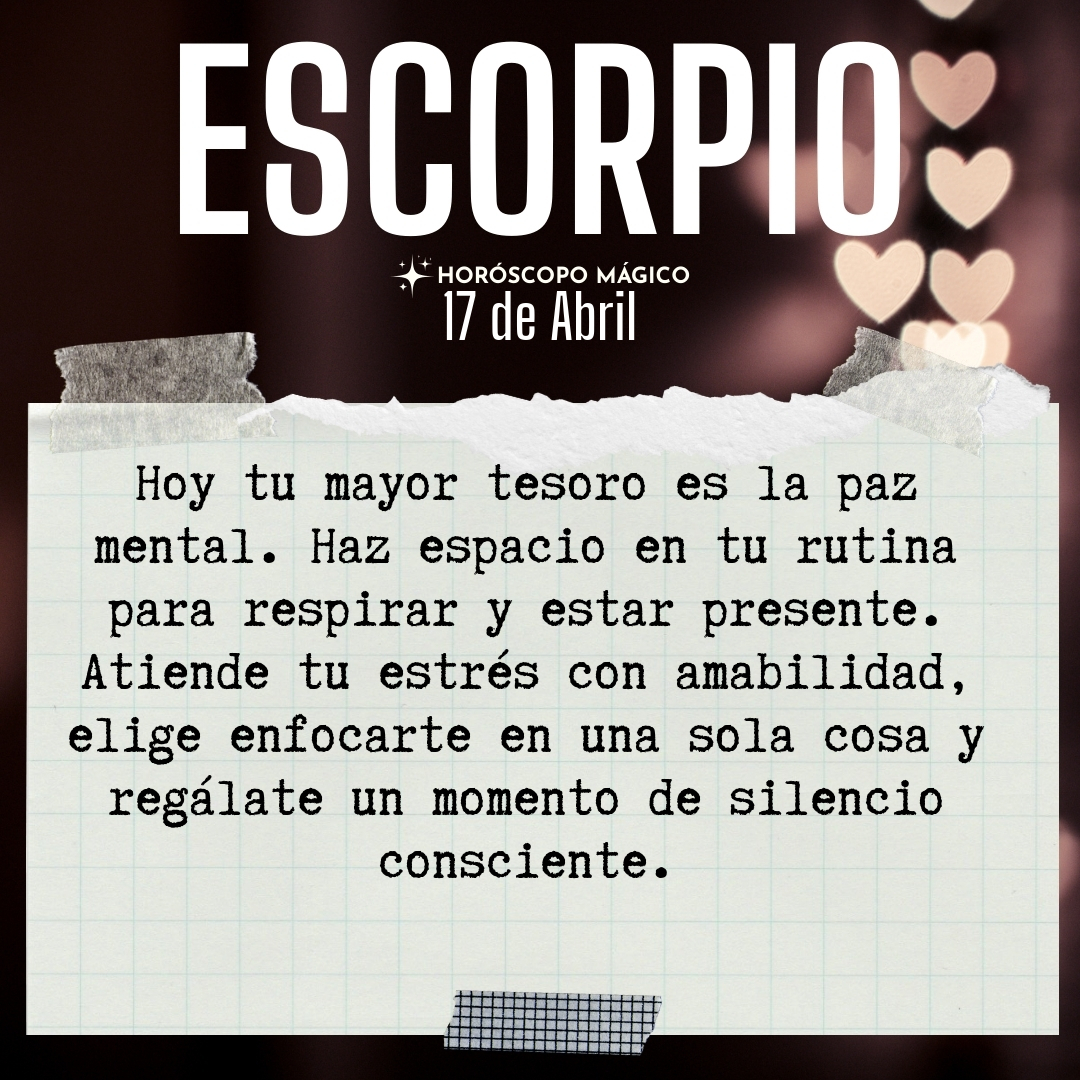 Hoy tu cuerpo te pide atención, Escorpio. No es solo cansancio, es una señal de que necesitas cuidarte más allá de lo básico. Has estado exigiéndote, y aunque tu energía suele ser intensa, también tienes límites. Escucha lo que sientes: ese dolorcito, esa tensión, esa falta de ganas. No lo ignores ni lo tapes con distracciones. Es momento de hacerte cargo de ti, de tu descanso, de tu alimentación, de tu movimiento. A veces, el cuerpo habla en susurros antes de gritar, y hoy te está pidiendo que lo escuches con honestidad y ternura.