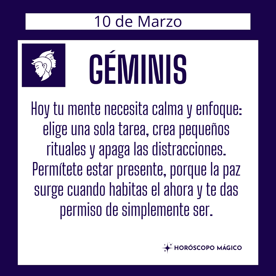 Hoy tu mente busca calma y enfoque. Has estado saltando de una cosa a otra, y eso te dispersa y te agota. Es momento de simplificar, de elegir una sola tarea y dedicarle tu atención plena. La paz mental no es ausencia de problemas, sino la capacidad de estar presente en lo que haces..