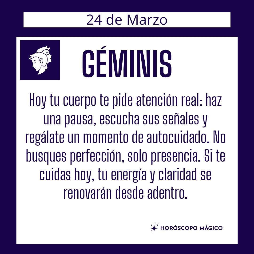 Hoy tu cuerpo te pide atención, Géminis. No es solo cansancio, es una llamada a escucharte más allá de la rutina. Has estado postergando pequeños gestos de autocuidado, creyendo que puedes con todo, pero tu energía necesita un respiro. Haz una pausa consciente, aunque sea breve, y siente cómo respiras, cómo se tensan tus hombros, cómo tu mente salta de un pensamiento a otro. No ignores esas señales, porque son la brújula que te devuelve al equilibrio. A veces, el simple acto de detenerte y reconocer lo que sientes puede ser el primer paso para sanar, para reconectar con esa parte de ti que pide ser vista y atendida.
