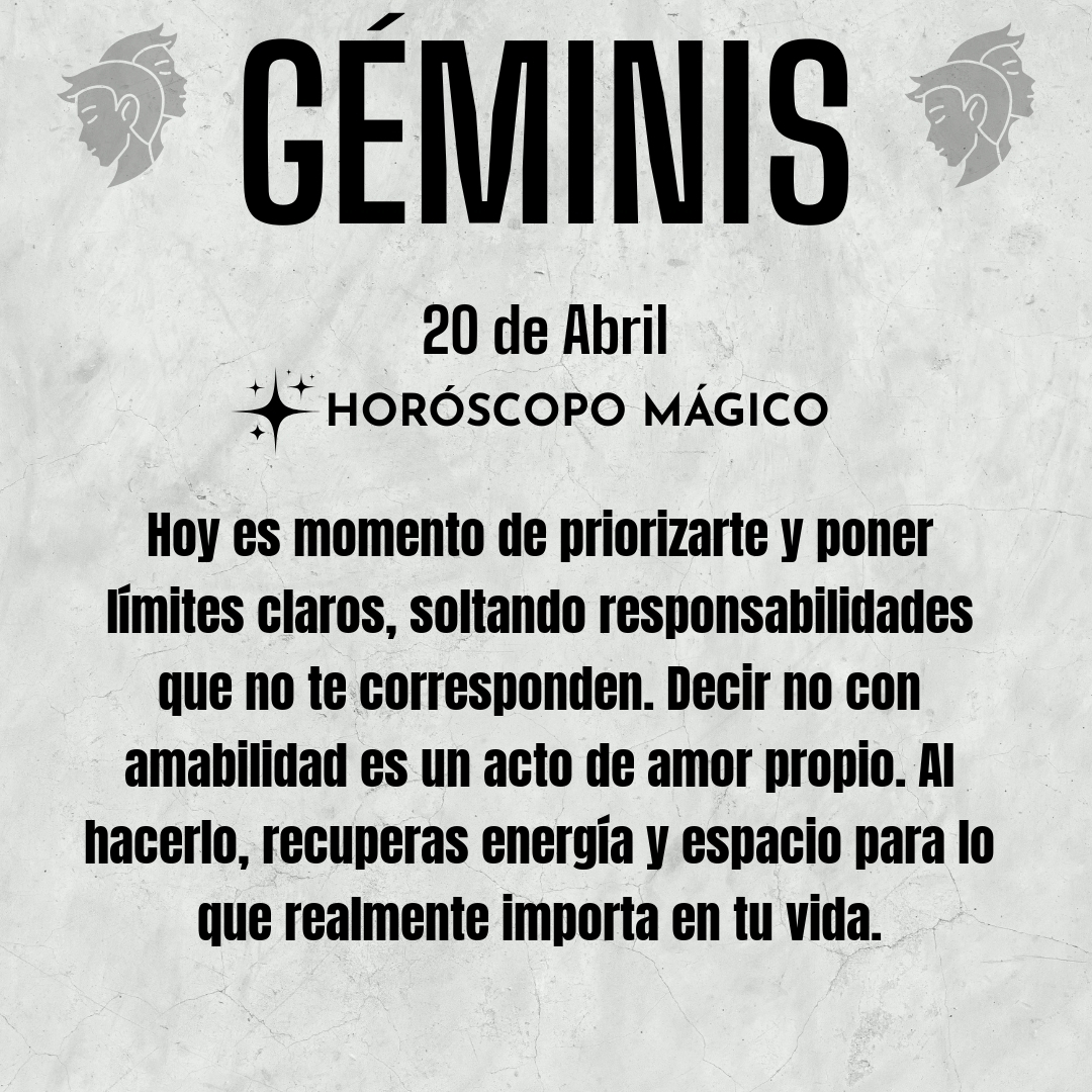 Hoy es un día para revisar tus límites, Géminis. Has estado cargando con responsabilidades que no te corresponden, quizá por miedo a decepcionar o por costumbre. A veces, te sorprendes a ti mismo diciendo sí cuando tu corazón grita que no, y esa contradicción va desgastando poco a poco tu energía vital. Pero tu energía no es infinita y mereces protegerla, mereces darte el espacio para respirar y reencontrarte contigo mismo. Observa dónde dices sí cuando quieres decir no, y date permiso para priorizarte, aunque al principio te parezca un acto egoísta o te cause cierta culpa.