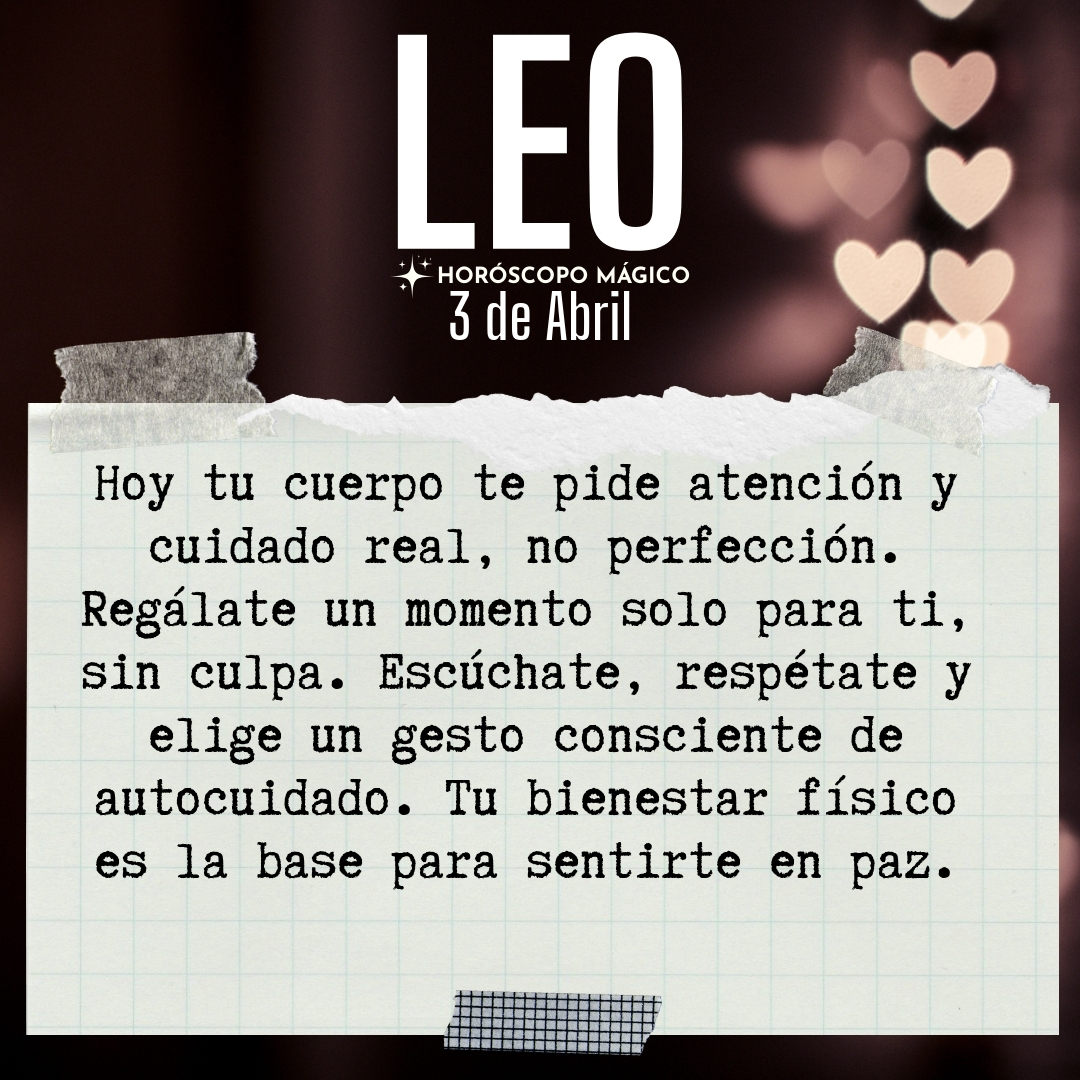 Hazlo por ti, no por los demás. Cuando te priorizas, el mundo responde distinto. Hoy, tu cuerpo es tu aliado más fiel. Escúchalo, respétalo y agradécele. Mañana, te lo devolverá en forma de energía y claridad. Recuerda que tu bienestar no es egoísmo, sino la base para poder dar lo mejor de ti a quienes amas y a tus proyectos. Cuando te permites ser tu prioridad, todo a tu alrededor se alinea de manera más armoniosa.