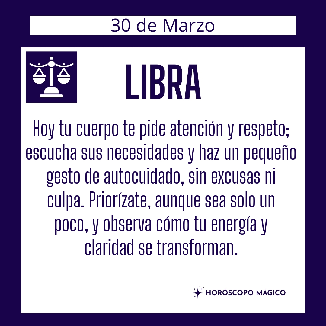 Hoy tu cuerpo te pide atención, Libra. No es solo cuestión de salud, sino de respeto hacia ti mismo. Has estado postergando pequeños gestos de autocuidado, creyendo que no son urgentes. Pero tu energía se resiente cuando te olvidas de ti, y lo sabes. Haz una pausa, respira profundo y escucha lo que tu cuerpo necesita: tal vez más agua, una caminata, o simplemente dormir mejor. A veces, el cansancio que sientes no es solo físico, sino también emocional, y surge de esa desconexión contigo mismo que se va acumulando en los días en que te dejas para después.
