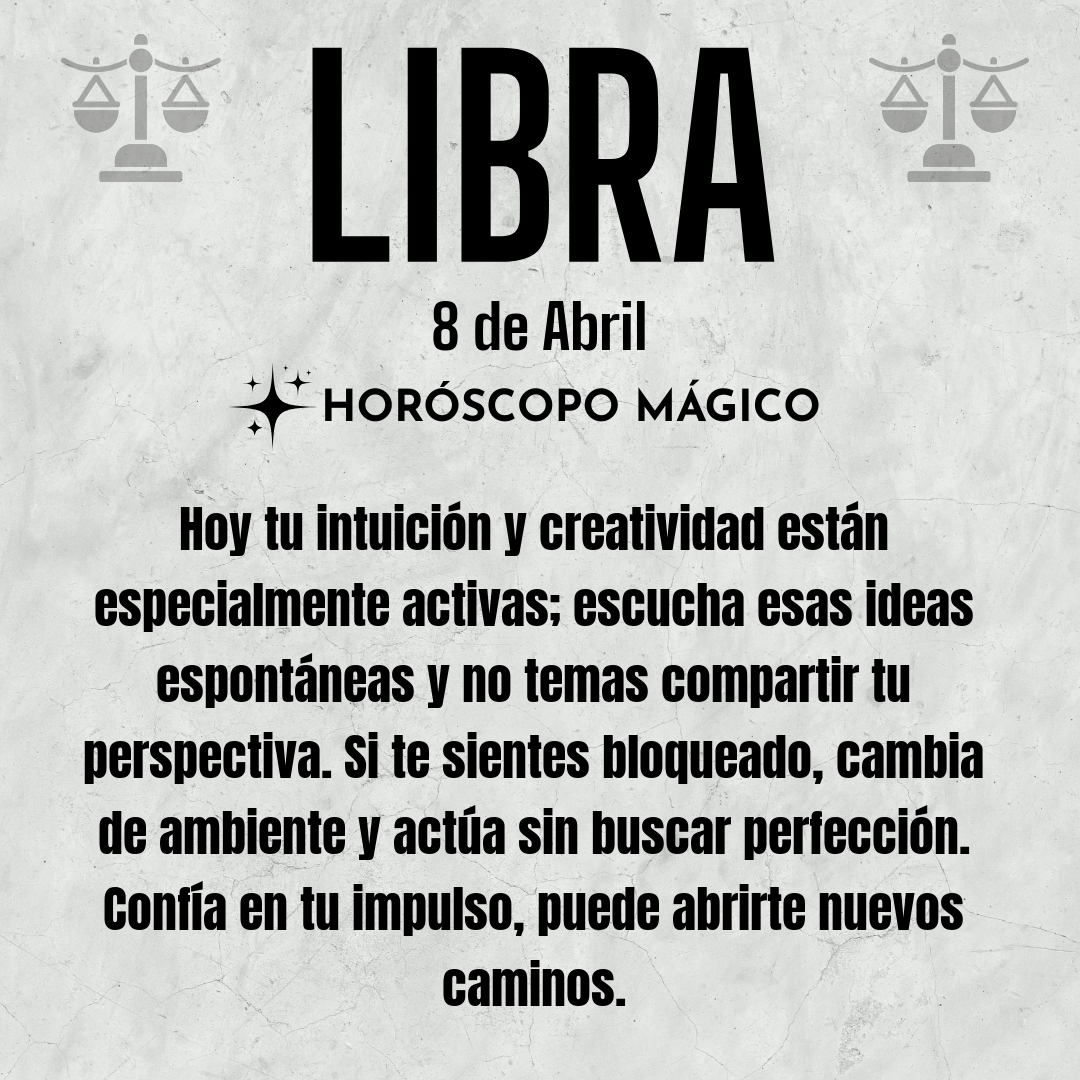 Tu intuición hoy está más despierta de lo habitual, Libra. Hay ideas que surgen de la nada, destellos de creatividad que te sorprenden en medio de la rutina. No los ignores. La mente racional es valiosa, pero a veces la mejor respuesta viene de ese susurro interno que no siempre sabes explicar. Permítete escuchar, aunque no entiendas del todo. Esos pequeños impulsos, esas corazonadas que aparecen sin previo aviso, pueden ser la llave para abrir puertas que ni siquiera sabías que existían. Hoy, más que nunca, tu sensibilidad está afinada y puedes captar matices que otros pasan por alto.