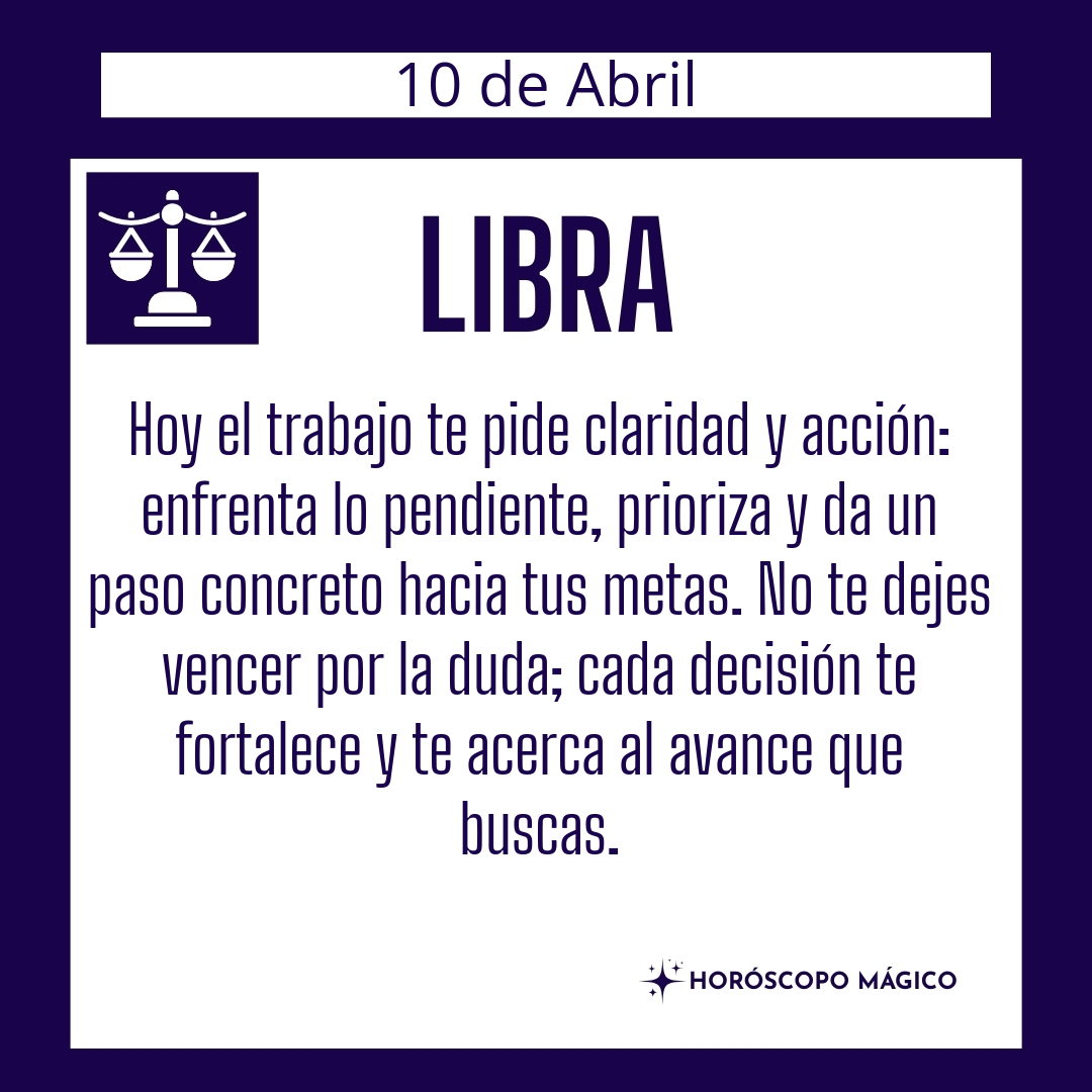 Hoy el trabajo te desafía a tomar decisiones prácticas, Libra. No es momento de postergar lo que sabes que debes enfrentar. Hay asuntos pendientes que requieren tu atención, detalles que pueden marcar la diferencia entre el estancamiento y el avance. La clave está en la claridad: define tus prioridades y actúa en consecuencia. A veces, la vida te coloca frente a encrucijadas que parecen pequeñas, pero que en realidad son puertas hacia nuevas oportunidades. Permítete observar con honestidad lo que realmente necesita tu energía hoy, sin distraerte con lo accesorio.