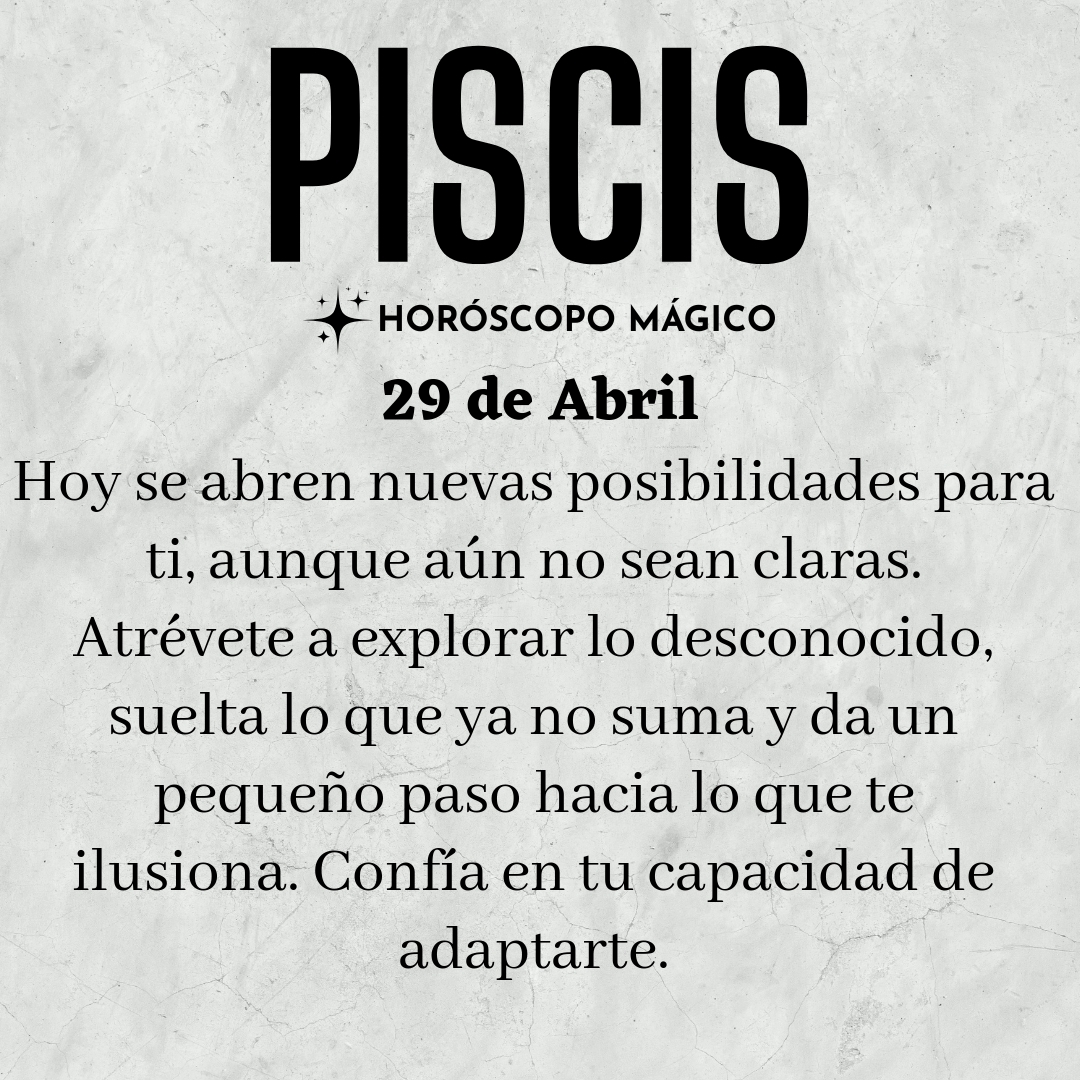 Sientes que algo nuevo se asoma en el horizonte, aunque aún no tenga forma definida. Es como si una brisa suave te rozara el alma, anunciando que algo está por llegar, aunque todavía no puedas ponerle nombre ni rostro. Hoy es un día para abrirte a los cambios, Piscis, sin miedo a lo desconocido, aunque tu corazón palpite con cierta inquietud ante lo incierto. Permítete respirar hondo y sentir cómo la vida te invita a dar un paso más allá de lo habitual, a mirar con ojos frescos lo que antes te parecía inamovible.