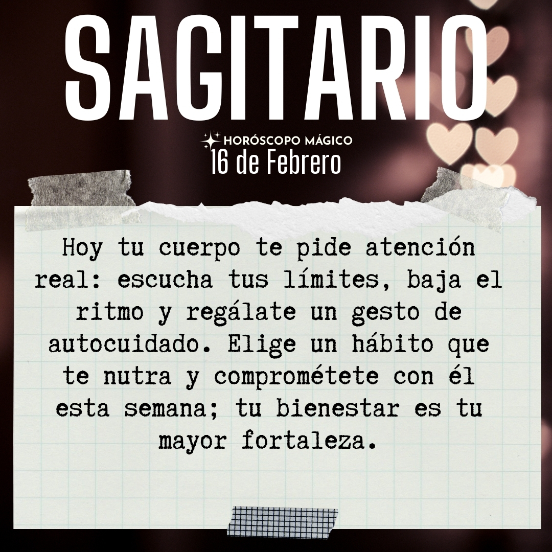 Hoy tu cuerpo te pide atención, Sagitario. No se trata solo de moverte o de cumplir con una rutina, sino de escuchar lo que realmente necesitas. A veces, el cansancio no es solo físico, sino una señal de que has estado ignorando tus propios límites. Haz una pausa, respira profundo y pregúntate: ¿qué me haría bien hoy? Tal vez sea un paseo sin prisa, una comida que nutra de verdad o simplemente dormir un poco más. No subestimes el poder de los pequeños gestos de autocuidado; son la base de tu energía y tu claridad..