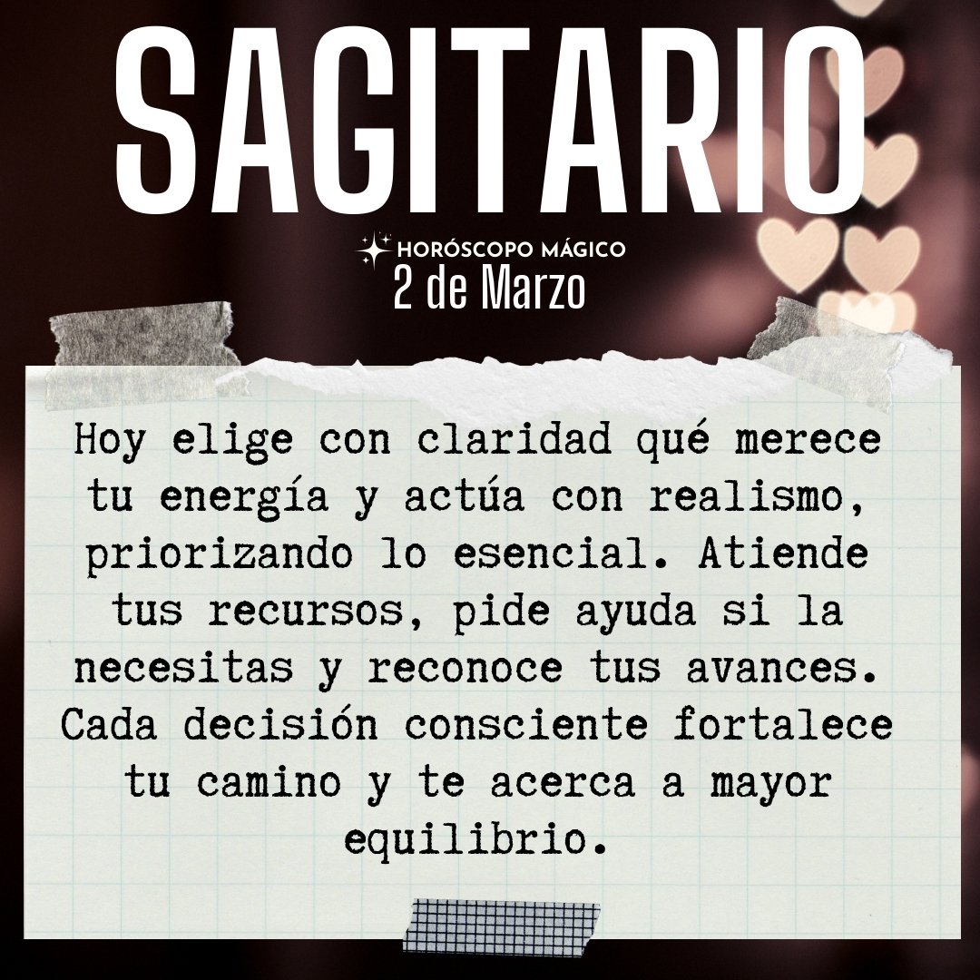 Hoy el trabajo te desafía a tomar decisiones prácticas, Sagitario. No es momento de dejarte llevar por la inercia, sino de mirar de frente lo que funciona y lo que no. Tal vez haya una oportunidad que te ronda, una idea que te inquieta o una tarea que has postergado. Hoy, la clave está en priorizar. Pregúntate: ¿qué es lo más importante ahora? No todo puede hacerse a la vez, y está bien elegir..