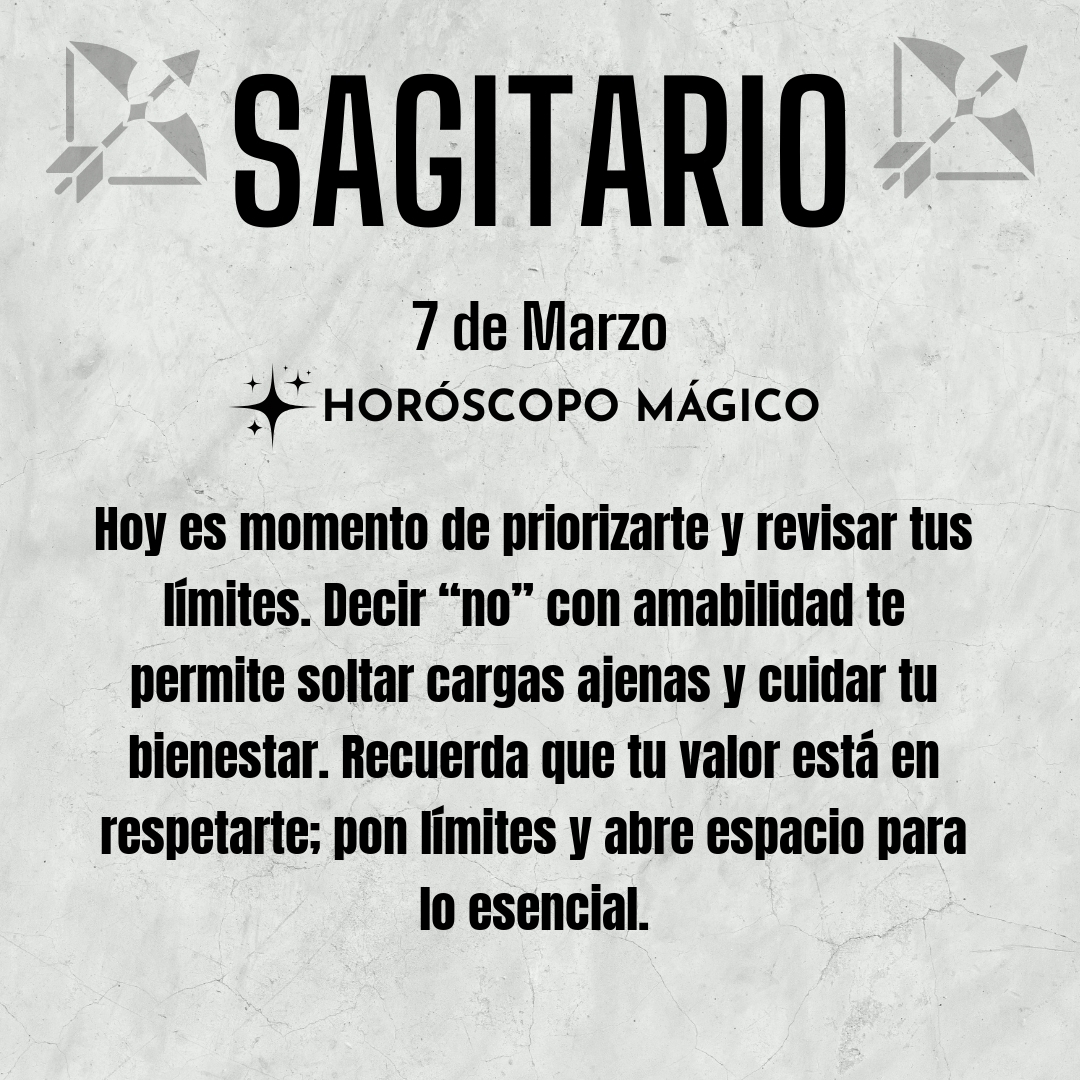 Hoy es un día para revisar tus límites y tu autoestima, Sagitario. Puede que últimamente hayas cargado con responsabilidades que no te corresponden, o que hayas dicho “sí” cuando en realidad querías decir “no”. No es egoísmo priorizarte; es un acto de amor propio. Reconoce dónde te has sobrepasado y decide hasta dónde quieres llegar. Permítete mirar hacia adentro y preguntarte honestamente qué necesitas en este momento, sin miedo a las respuestas que surjan desde lo más profundo de tu ser.