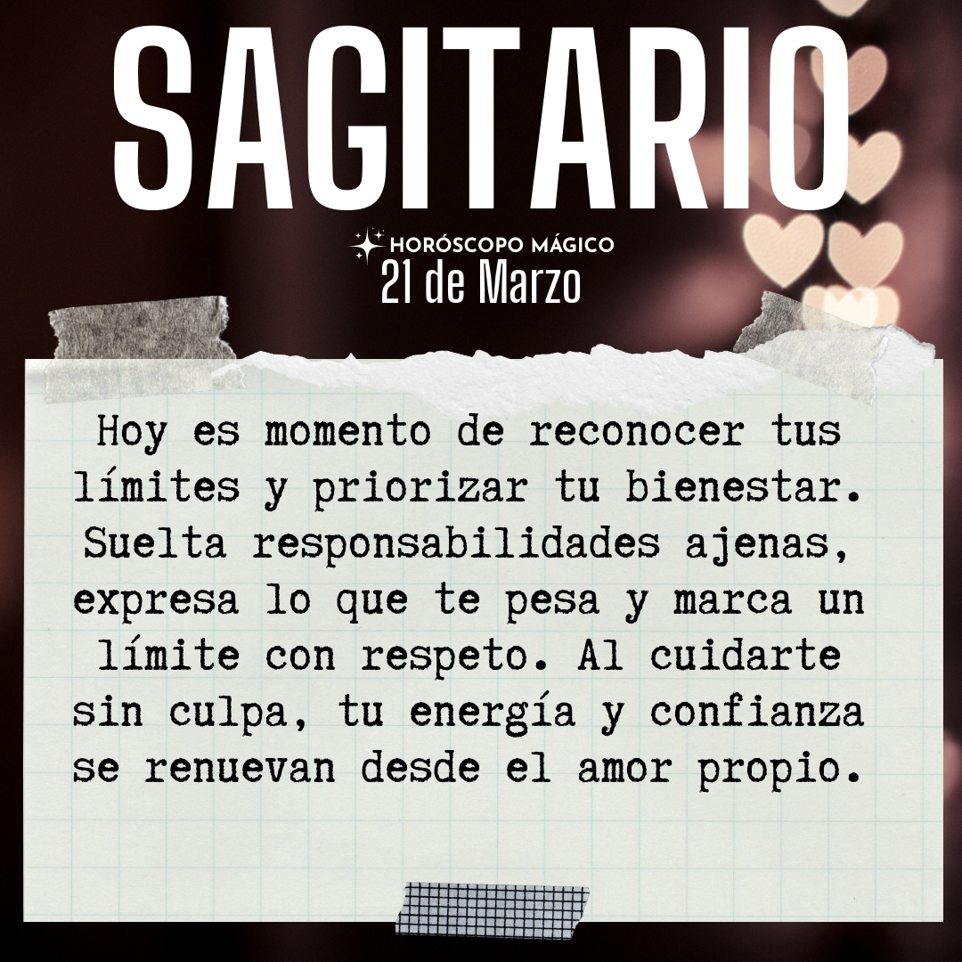 Hoy es un día para abrazar tu vulnerabilidad y tu fortaleza. Permítete ser humano, con necesidades y deseos propios. Al hacerlo, te acercas a una versión más íntegra de ti mismo, una versión que sabe cuándo dar y cuándo detenerse. Confía en que el universo apoya cada paso que das hacia tu autocuidado. Hoy, Sagitario, elige ser tu mejor aliado, y verás cómo la vida responde con nuevas oportunidades de amor, respeto y equilibrio.