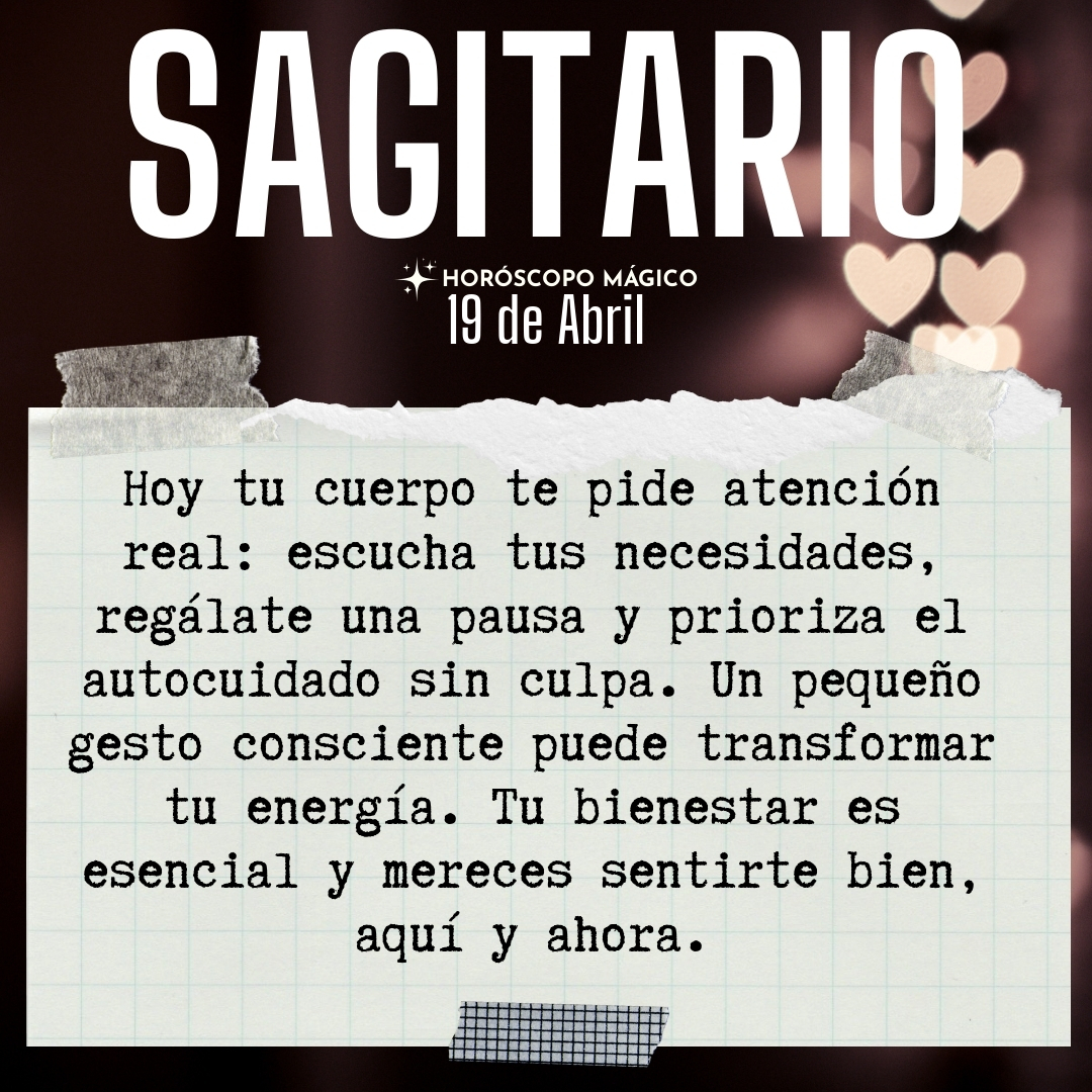 Permítete ser humano, con tus límites y tus necesidades. Reconoce que cuidarte es un acto de amor propio, y que ese amor se expande hacia todo lo que tocas. Hoy, Sagitario, regálate la oportunidad de sentirte en paz contigo mismo, aunque sea por unos minutos. Ese pequeño gesto puede ser el inicio de un gran cambio, uno que te acerque cada vez más a la vida que mereces vivir.