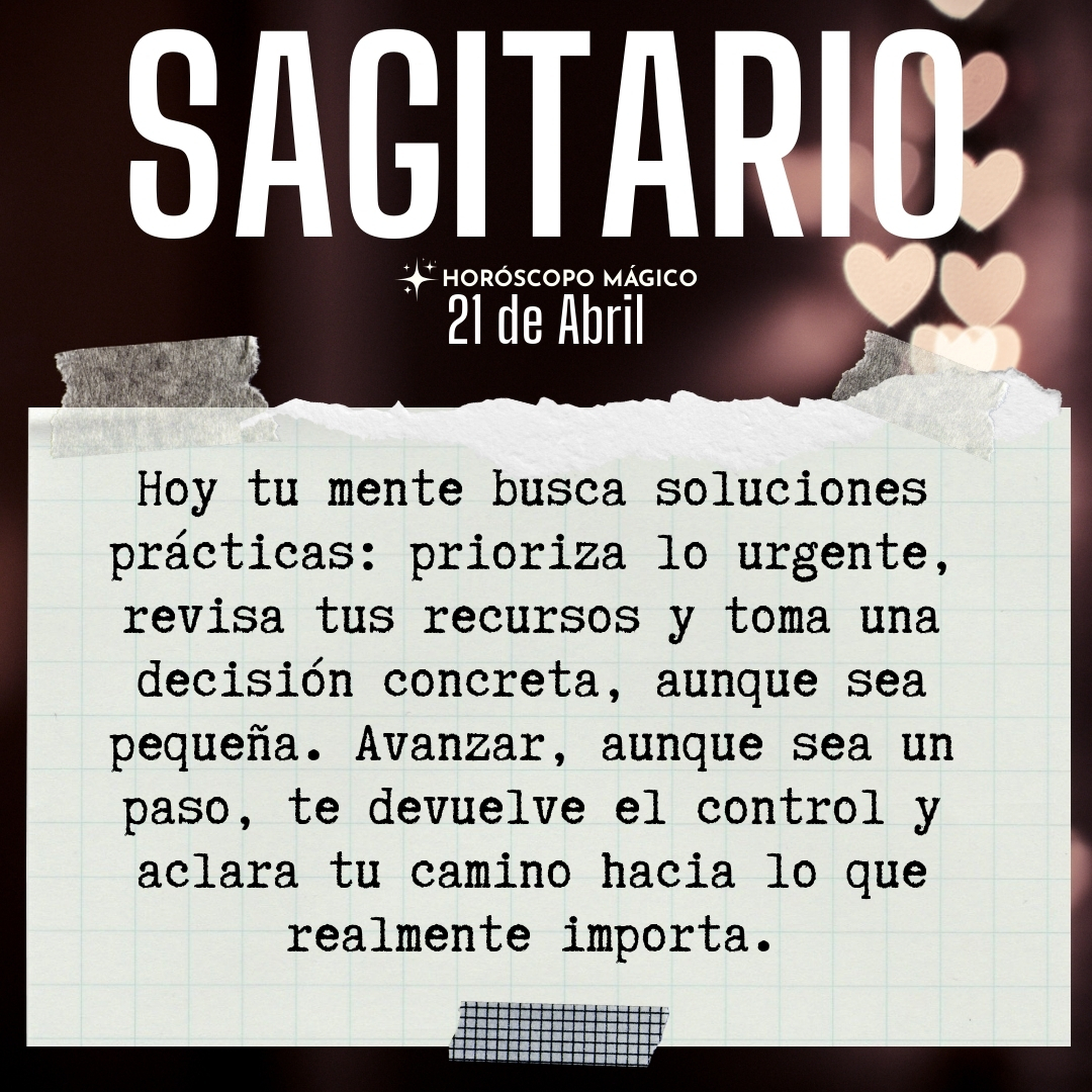 Hoy tu mente está enfocada en lo práctico, Sagitario. Hay decisiones que no pueden esperar más, especialmente en temas de trabajo o dinero. Puede que sientas cierta presión, como si el tiempo te apremiara y las responsabilidades se acumularan sobre tus hombros, pero también una energía renovada para tomar las riendas. Es como si dentro de ti surgiera una chispa de determinación, una voz interna que te recuerda que eres capaz de enfrentar cualquier desafío. No dejes que la duda te paralice, aunque a veces el miedo al error o a lo desconocido intente frenarte. Haz una lista de lo que realmente importa y prioriza lo urgente sobre lo accesorio, permitiéndote así liberar espacio mental y emocional para lo que de verdad merece tu atención.