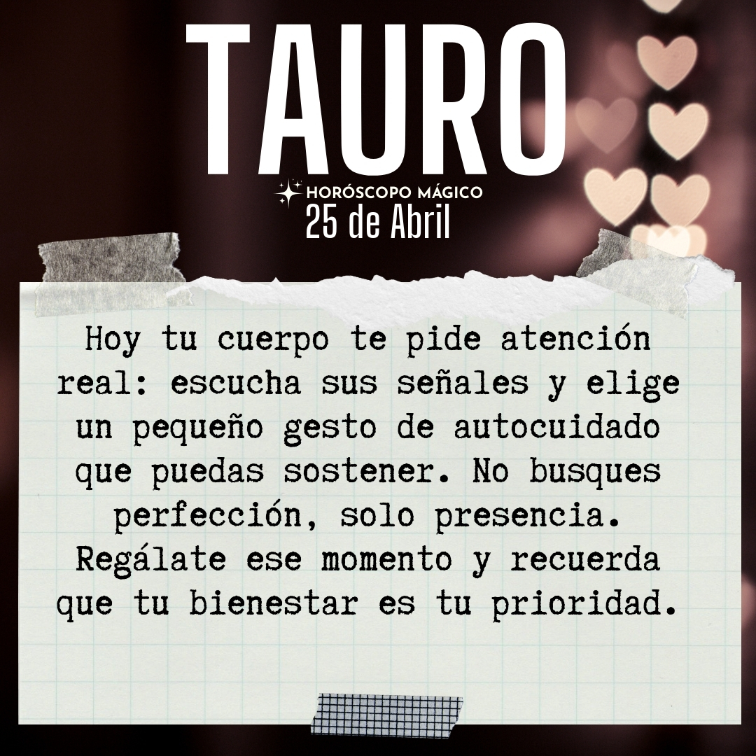 Hoy tu cuerpo te pide atención, Tauro. No es solo cansancio, es una llamada silenciosa a escucharte más allá de la rutina. Has estado postergando pequeños gestos de autocuidado, creyendo que puedes con todo, pero tu energía merece respeto. Haz una pausa, respira profundo y siente dónde necesitas suavidad, descanso o movimiento. No ignores esas señales sutiles que te envía tu físico, porque ahí está la clave para sostenerte con fuerza. A veces, el cuerpo habla en susurros: una tensión en los hombros, un bostezo inesperado, una sensación de pesadez al despertar. Esos detalles, que a menudo pasas por alto, son mensajes que te invitan a reconectar contigo.