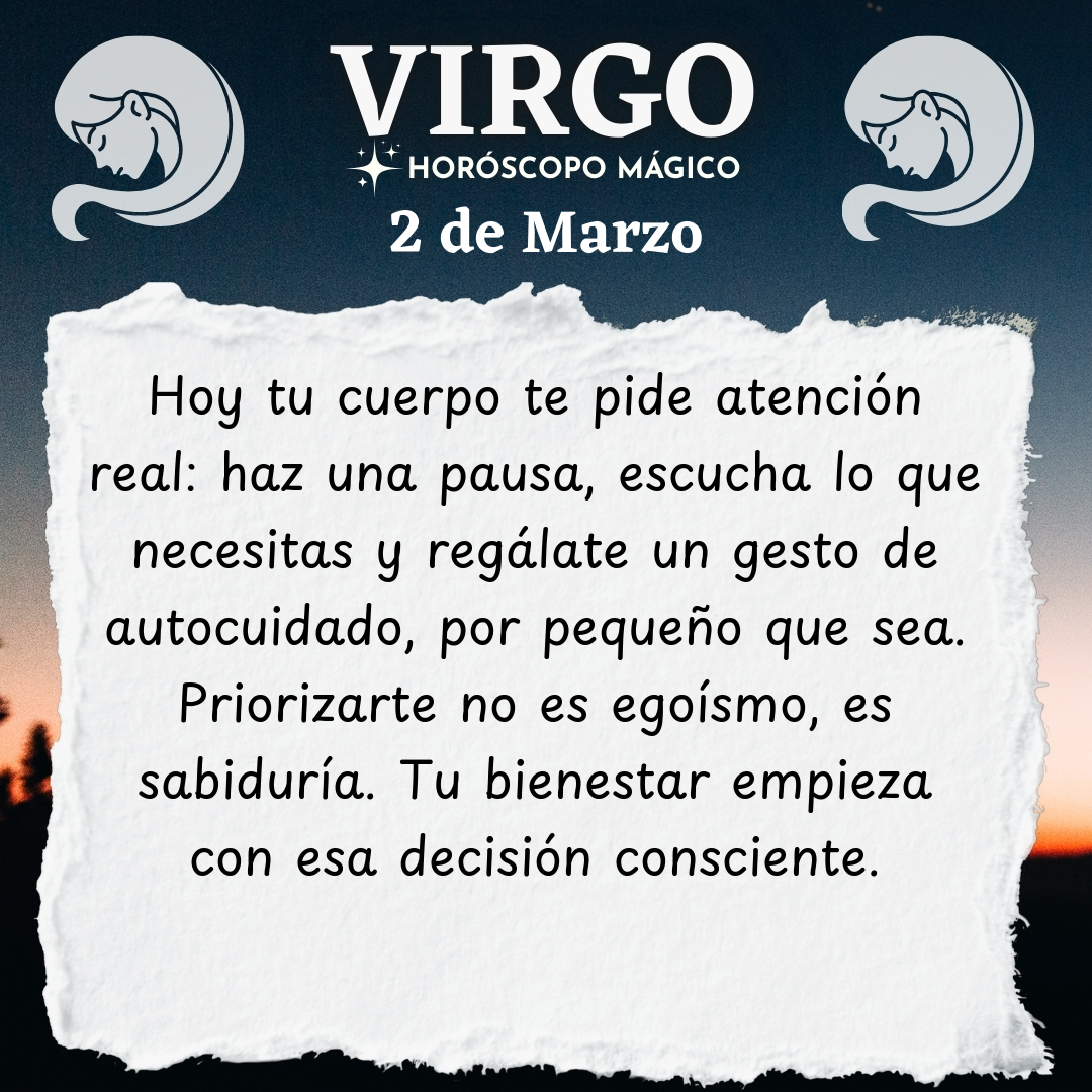 Hoy tu cuerpo te pide atención, Virgo. No es solo cansancio físico, es una llamada silenciosa a escucharte más allá de la rutina. Has estado postergando pequeños gestos de autocuidado, creyendo que no son urgentes. Pero tu energía se resiente cuando te olvidas de ti. Haz una pausa consciente, aunque sea breve. Respira hondo, siente tus pies en el suelo y pregúntate qué necesitas de verdad. Tal vez sea un paseo, una comida más nutritiva o simplemente dormir un poco más. No subestimes el poder de lo simple. Hoy, regalarte ese espacio es un acto de amor propio que te recarga y te centra..