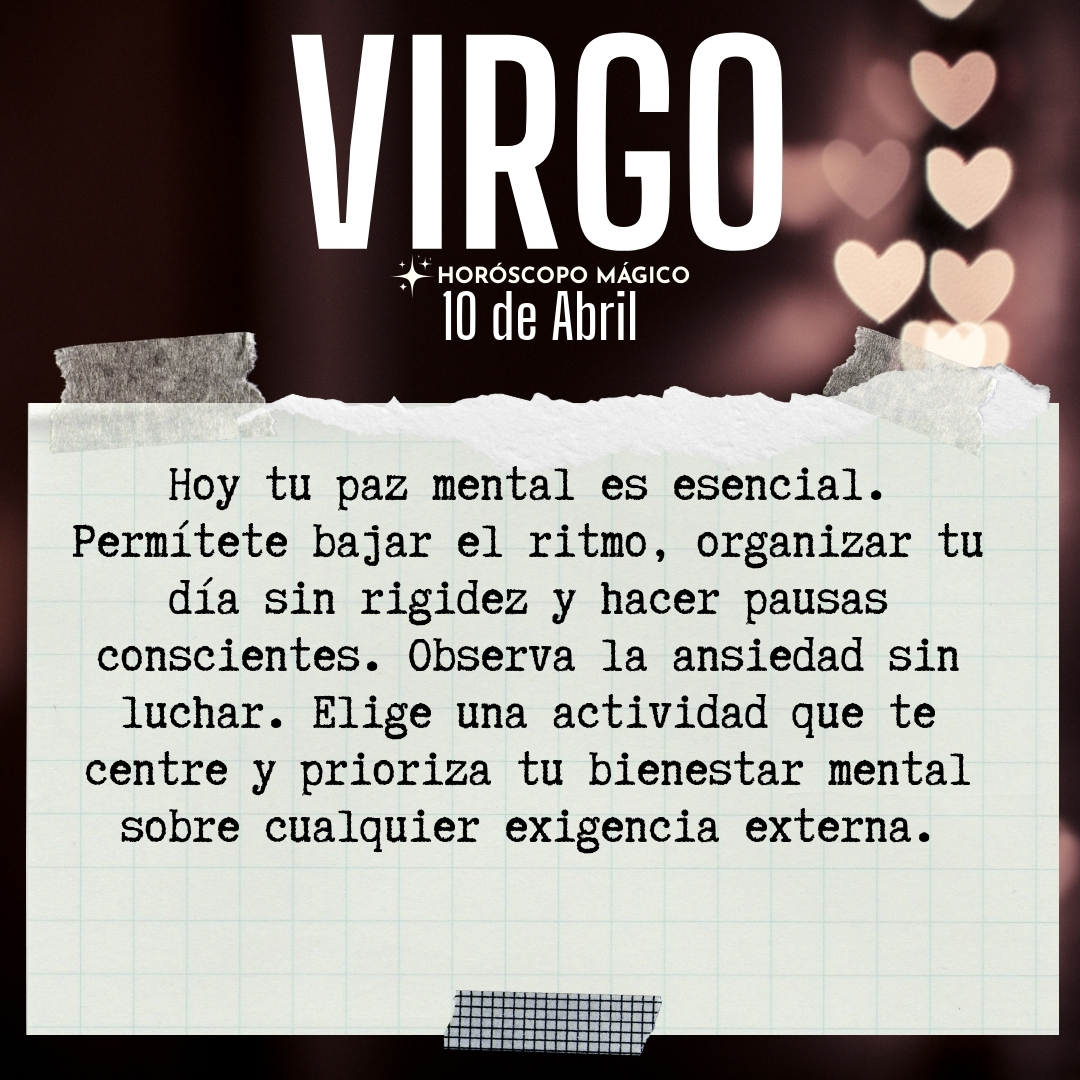 Hoy la paz mental es tu mayor tesoro, Virgo. Has estado en medio de muchas exigencias, y tu mente necesita un respiro. Sientes cómo las demandas externas a veces se acumulan como olas, una tras otra, y es natural que busques un refugio interior donde puedas volver a ti. No se trata de huir de tus responsabilidades, sino de encontrar un ritmo que te permita respirar y pensar con claridad, de darte permiso para soltar la presión que a menudo te impones. La rutina puede ser tu aliada si la usas a tu favor, convirtiéndose en ese espacio seguro donde puedes ordenar tus pensamientos y reconectar con lo esencial.